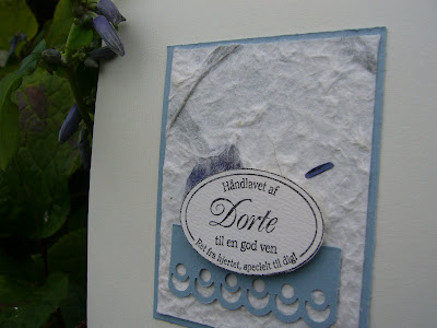 Jeg havde noget håndlavet papir som passede til et "soft" kort. Sommerfuglene er pyntet med perler og MS borden har fået selskab af bånd fra Panduro.